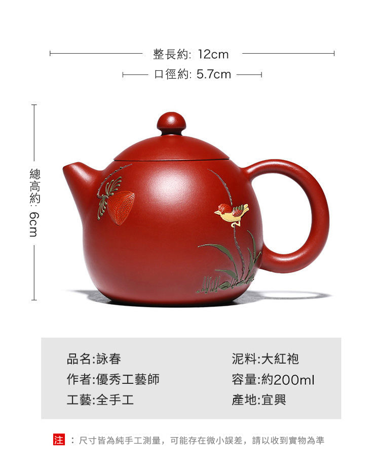 2分鐘前【經典器型 • 別出心裁】正宗宜興原礦大紅袍紫砂壺☞吳敏純手工匠心製作詠春龍蛋一壺四杯 - 大紅袍花香龍單壺200cc